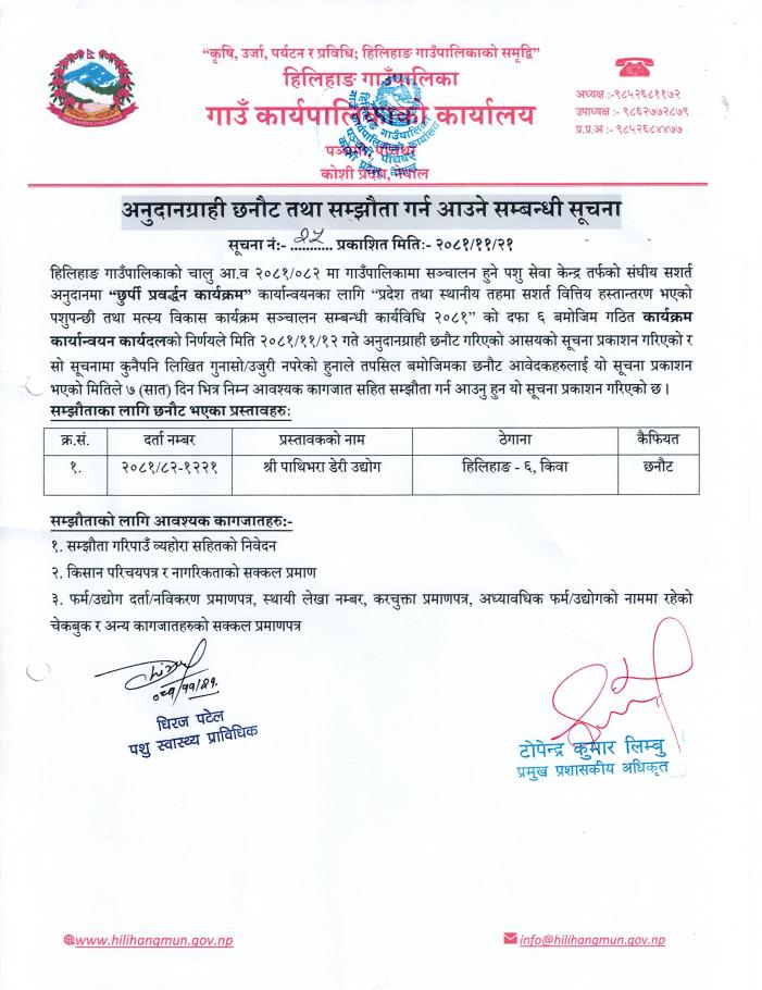 » अनुदानग्राही छनौट तथा सम्झौता गर्न आउने सम्बन्धी सूचना ॥