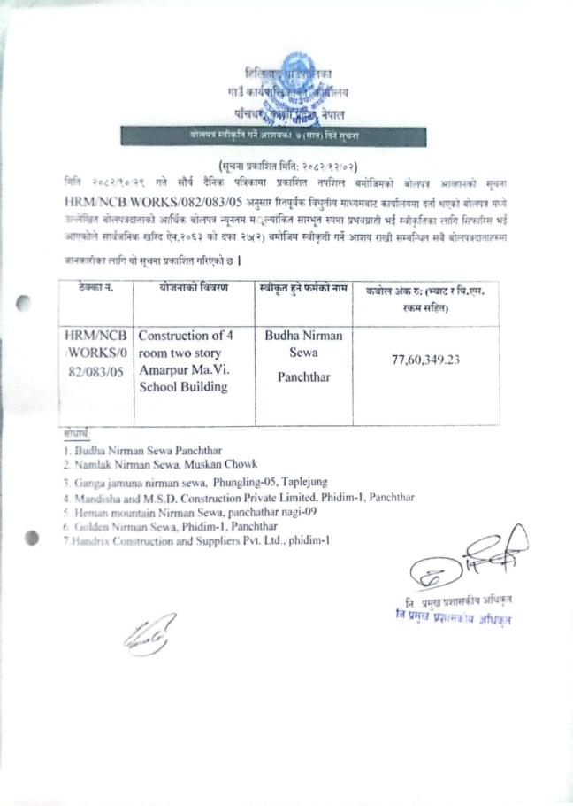 बोलपत्र स्वीकृत गर्ने आशयको सूचना ॥