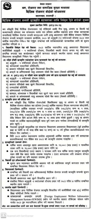 वैदेशिक रोजगार सन्तती छात्रवृत्ति सम्बन्धी सूचना २०८२ ।।
