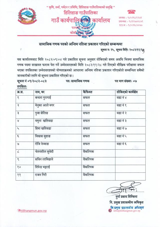 सामाजिक गणक पदको अन्तिम नतिजा प्रकाशन बारे ।।