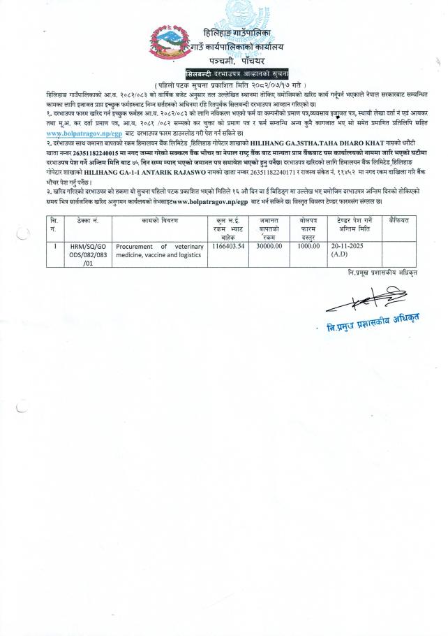 आ.व. २०८२/८३ को आन्तरिक आय ठेक्का बन्दोवस्त सम्बन्धी दरभाउपत्र आव्हानको सूचना ॥