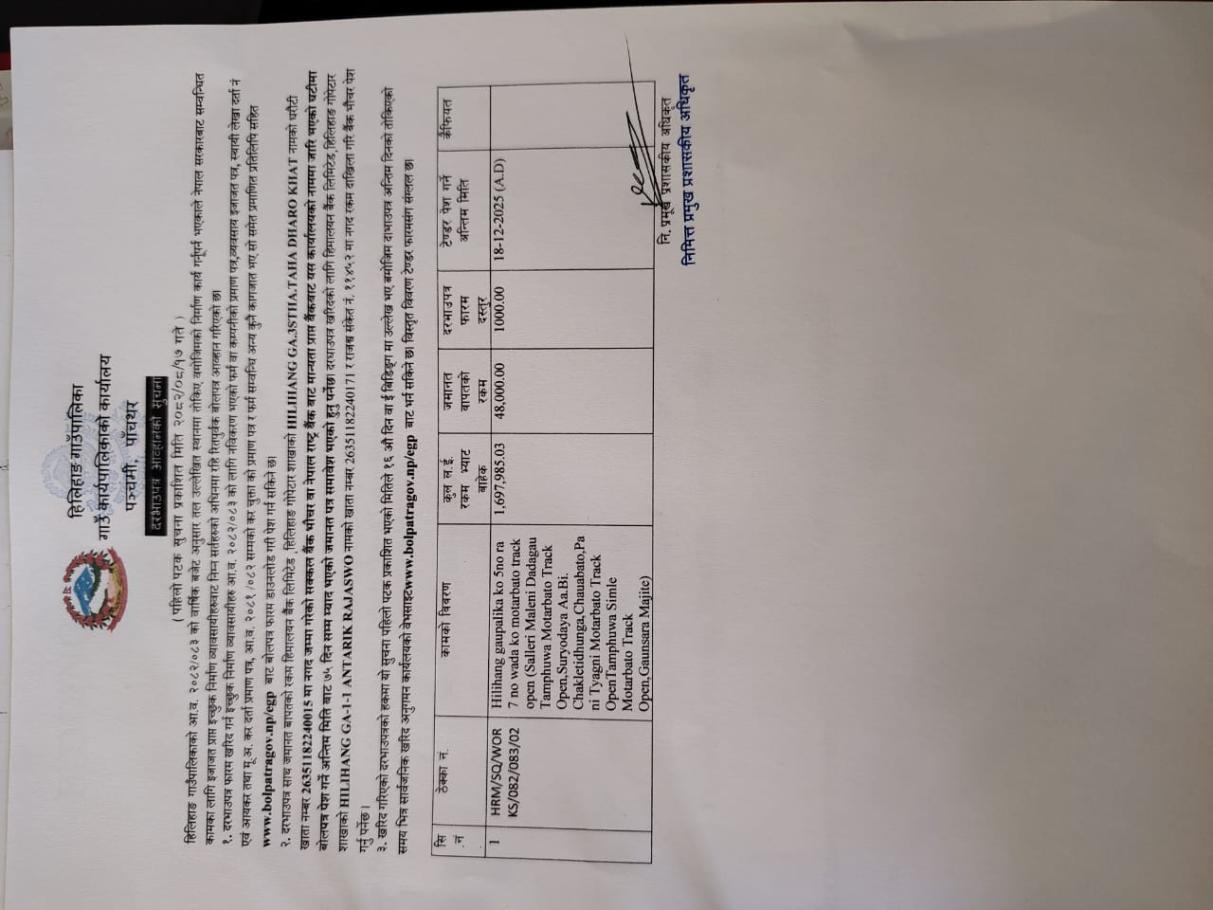 आ.व. २०८२/८३ को आन्तरिक आय ठेक्का बन्दोवस्त सम्बन्धी दरभाउपत्र आव्हानको सूचना ॥
