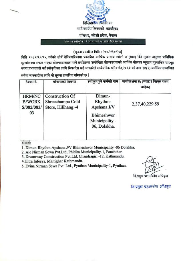 बोलपत्र स्वीकृत गर्ने आशयको सूचना ॥