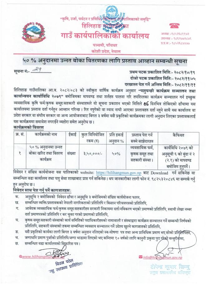 ५०% अनुदानमा उन्नत बोका वितरणका लागि प्रस्ताव आव्हान सम्बन्धी सूचना (दोस्रो पटक) ॥